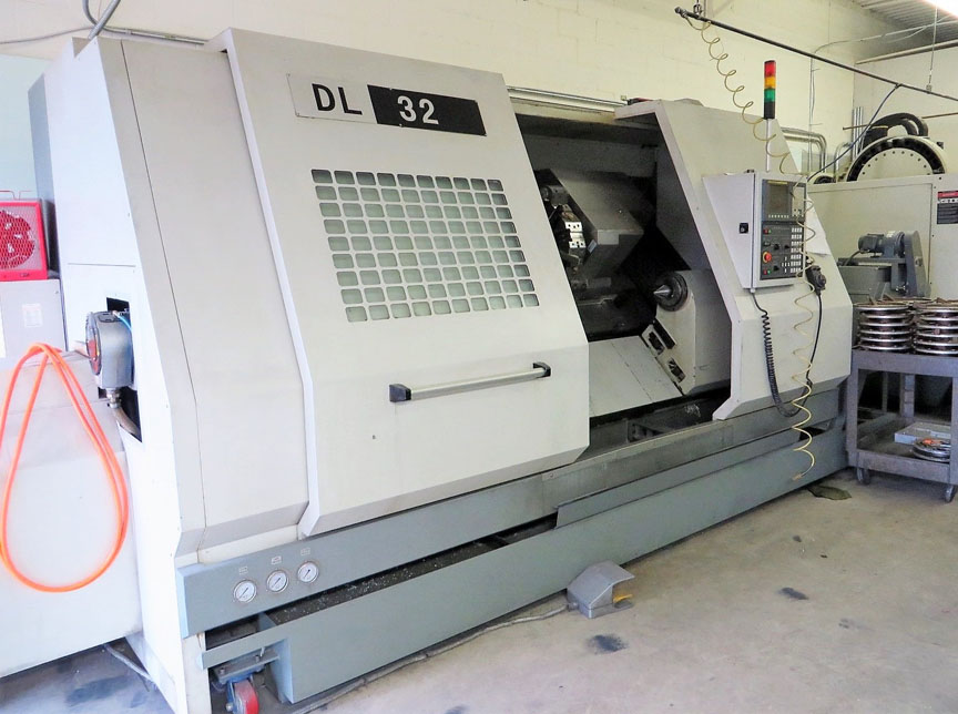 • DTMG DL-32/1000 CNC Lathe, with Fanuc 0iTC CNC control, 26.77” max. swing over bed, 16.14” max. swing over carriage, 39.37” max. machining length, approx. 48″ between centers, 15″ 3-jaw chuck, 12-position turret, 3.93” spindle bore, 2000 RPM max. spindle speed, 40 HP motor, tool eye, hydraulic tailstock, chip conveyor, S/N not available, New 2008 (approx.)