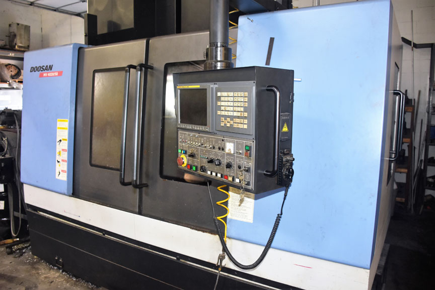 • DOOSAN MV-4020/50 CNC Vertical Machining Center, with Fanuc 21iMB CNC control, Travels: X-40.16”, Y-20.08”, Z-24.6”, 47.2” x 19.7” table, 1760 lb. max. work weight, 24 ATC, 8000 RPM, 25 HP motor, CAT 50 taper, chip conveyor, through spindle coolant, S/N AV5E3252, New 2003