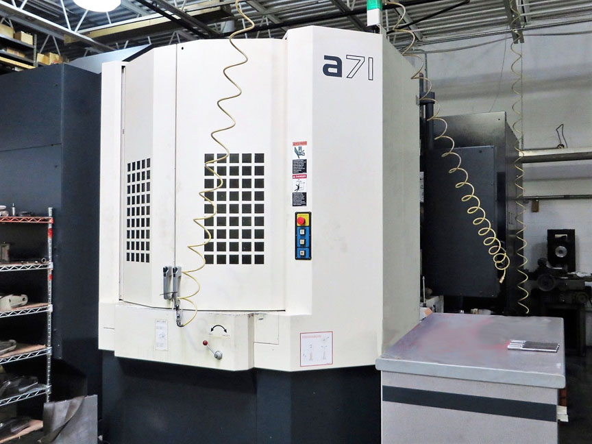 • MAKINO A71 4-Axis CNC Horizontal Machining Center, with Makino Pro-5 CNC control, Travels: X-29”, Y-29”, Z-32”, full B-axis rotation, dual 19.7” x 19.7” pallets, 1540 lb. workpiece weight, 47 HP motor, 60 ATC, 10,000 RPM, CAT 50 taper, through spindle coolant, chip conveyor, SN 649, New 2007
