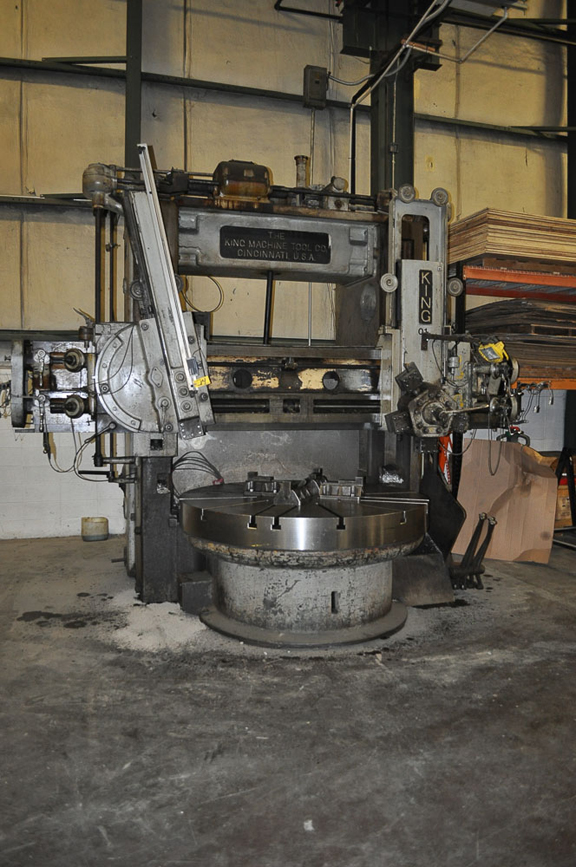 King 72” Vertical Boring Mill, with 72” table, 79” max swing, 60” height under rail, 1.3 – 45 RPM table speeds, feeds .003 to .500 IPR, 30HP main motor, 36” vertical travel of turret, 60” right hand turret travel cross, 214” machine width left to right, 156” machine depth front to back, 158” machine height, 55,000# max weight, [2] turret heads, rapid traverse on all heads, power rail elevation, flush mounted machine, no pit required, S/N: 2545[Located @ 5320 S. National Dr, Knoxville, TN 37914]