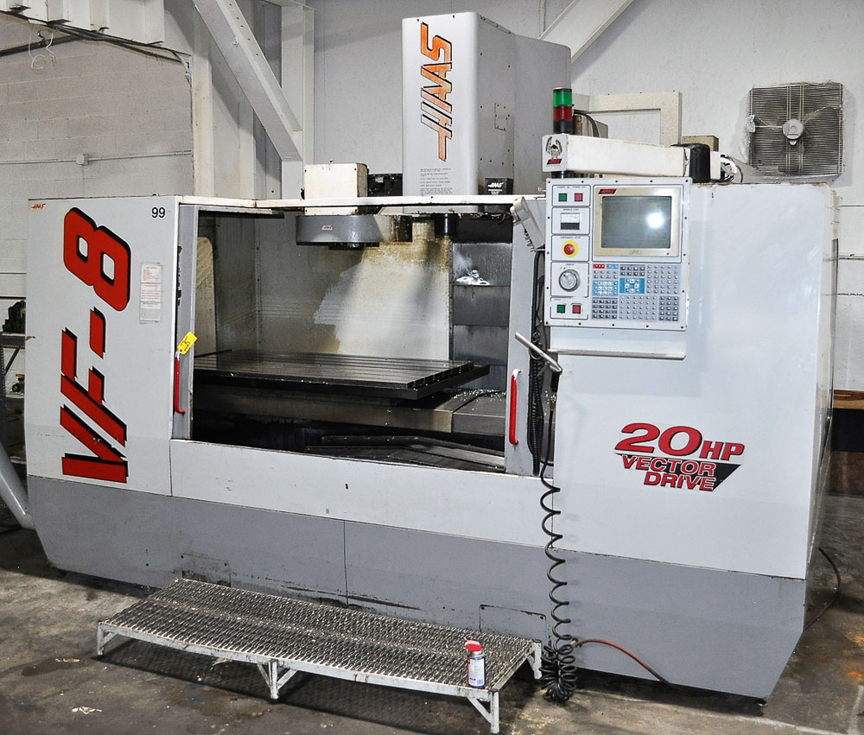 Haas Mdl. VF5 CNC Vertical Mill, with 62” x 23” table, 4” high slotted sub table, travels: x-50”, y-26”, z-25”, rapids x/y/z 710 IPM, 20HP spindle drive, 7500 RPM spindle speed, CAT 40 spindle taper, 20-position automatic tool changer, programmable coolant, geared head, remote joy handle, floppy drive, 14,600# max weight, S/N: 17407 (1999)