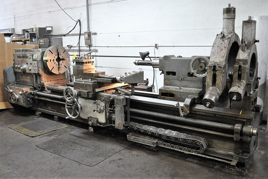 Danichi Mdl. DM-300 Engine Lathe, with 30” swing over bed, 124” distance between centers, 4” spindle bore, 21” swing over cross slide, 8-650 RPM, 20HP motor, 24” 4-jaw chuck, 15” steady rest, 20” steady rest, inch / metric threading, 14” removable gap, tailstock, 4-way rapid traverse on saddle, Newall digital readout, 15,000# max weight capacity, S/N: 14330 (1976)