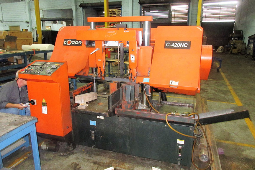 2008 COSEN C420NC HORIZONTAL BAND SAW, s/n C9714196, Blade Speeds 20-100 m/Per Minute, Blade Size 4770mm, Hydraulic Vices, to include: 2ea Feed Tables, 230V, 60Hz, Weight 7000, Dimensions 103 x 140 x 70 Inches