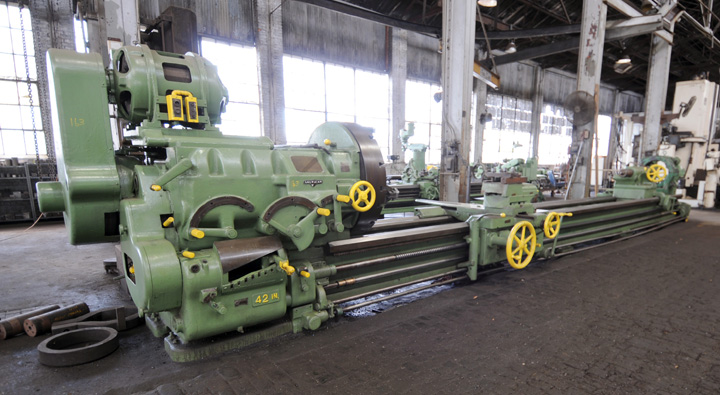 AMERICAN 44″ X 26′, spds: 1.8-157 RPM, built-in faceplate, 4-jaw chuck, followrest, bed mtd. sliding taper attach., (4) steadyrests, rapid traverse, S/N 61358