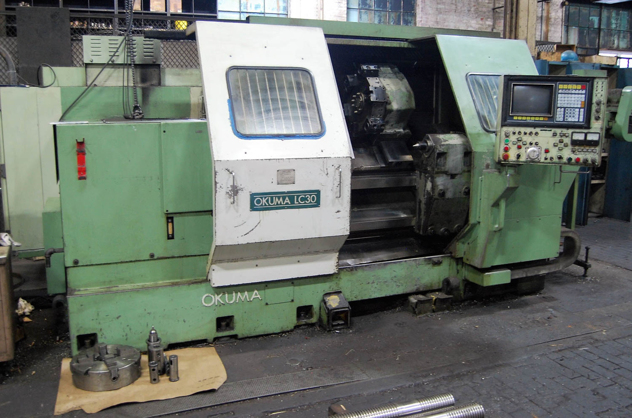 Okuma LC30-ISC CNC slant bed lathe, tailstock, 12-position turret, approximately 3,000 RPM, chip conveyor, 12” 2-jaw chuck, 15” 4-jaw chuck, OSP-5000L-G control, S/N: 1213