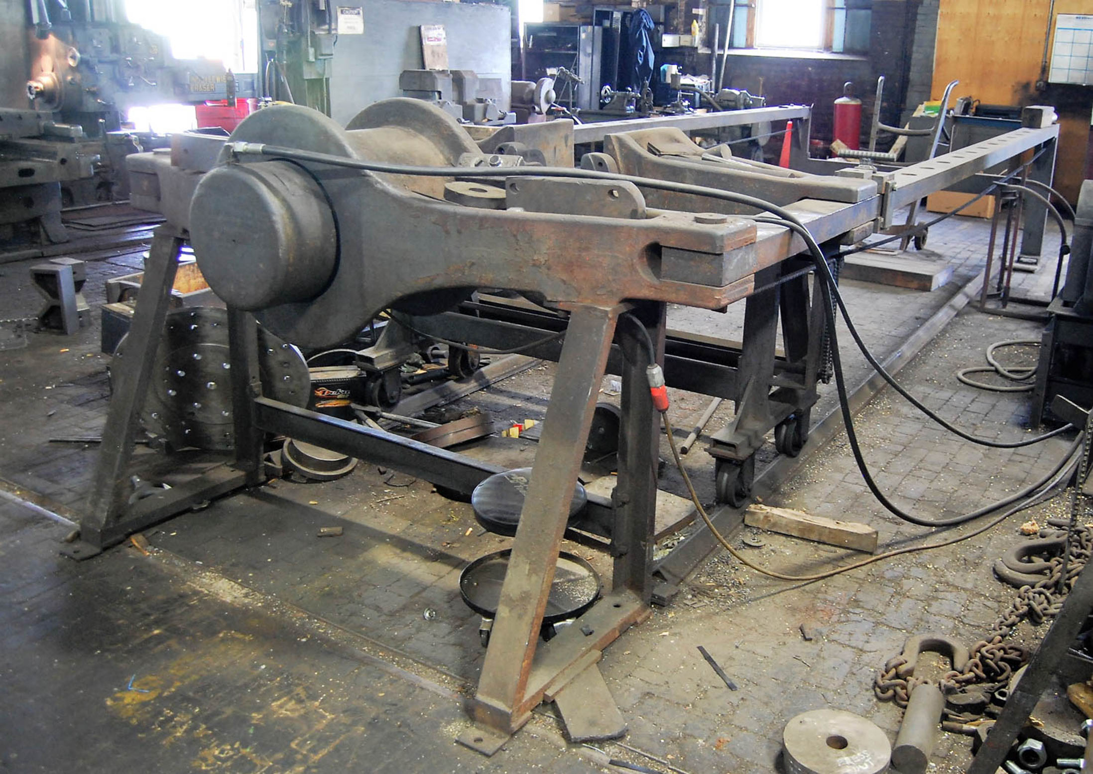 300 Ton (approximately) Horizontal Wheel Press, 15’ long, 72” between rails, hydraulic unit, track mounted support