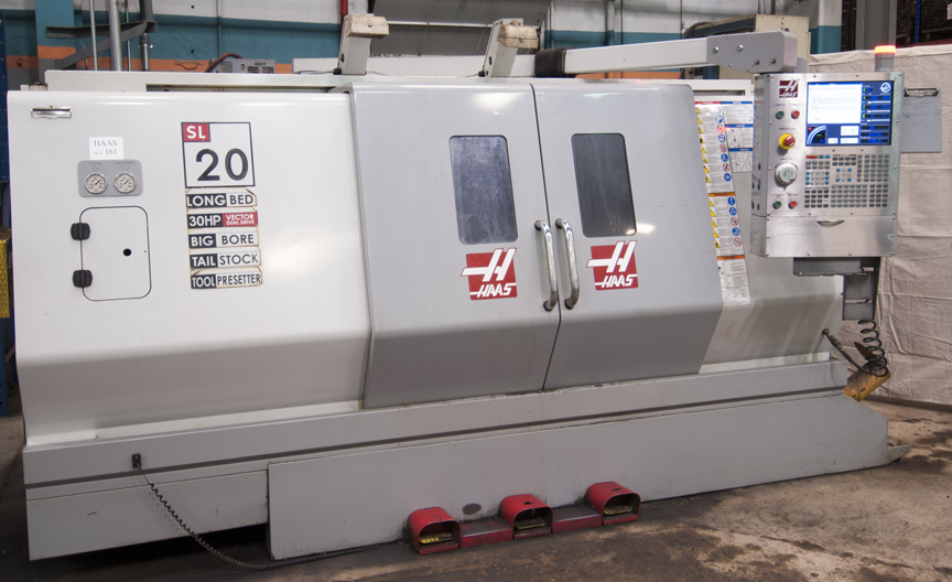 - HAAS (2008) SL20L long bed big bore CNC turning center with HAAS CNC control, 23” swing, 42” max turning length, 3” spindle bore, 2.5” bar capacity, travels X – 16” , Y – 9.8” , Z- 22.75”, KITAGAWA 10” 3-jaw hydraulic chuck, 10 station turret, 30 HP motor, tailstock, tool presetter, chip auger, s/n: 3081261