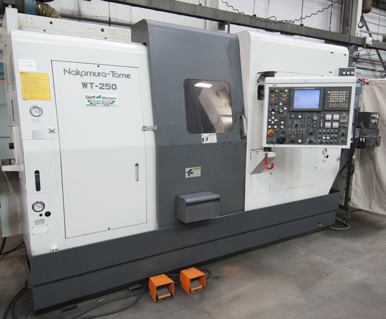 - NAKAMURA (2010) TOME WT-250 CNC twin spindle turning and milling center, twin opposed spindles, twin opposed 12-station turrets, with FANUC series 18i-TB CNC control, c-axis, live milling, y-axis, 9.84” max. turning diameter, 21.85” max turning length, travels X1 – 7.68”, X2 – 7.68, Z1 – 23.62”, Z2 – 23.62”, Y ±1.61”, speeds to 4500 RPM, LNS SPRINT S3 automatic bar feeder, LNS BLAZE AIR automatic un-loader, HAKUSAN chip conveyor, MCLEAN chiller, s/n: M241502