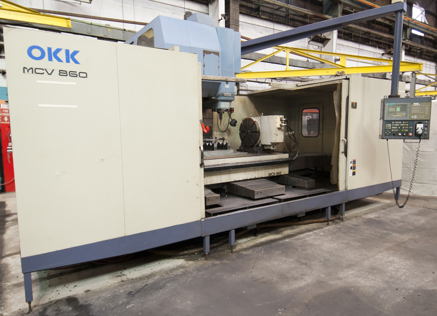 - OKK MCV860 4-axis CNC vertical machining center with OKK NEOMATIC 635 CNC control, 90” x 34” T-slot table, travels X- 80.31” , Y – 33.86” , Z – 28.35”,speeds to 6000 RPM, CAT 50, 40 station ATC, TSUDAKOMA 20” diameter CNC, 4th axis table with tail stock, turbo conveyor chip conveyor s/n: 250