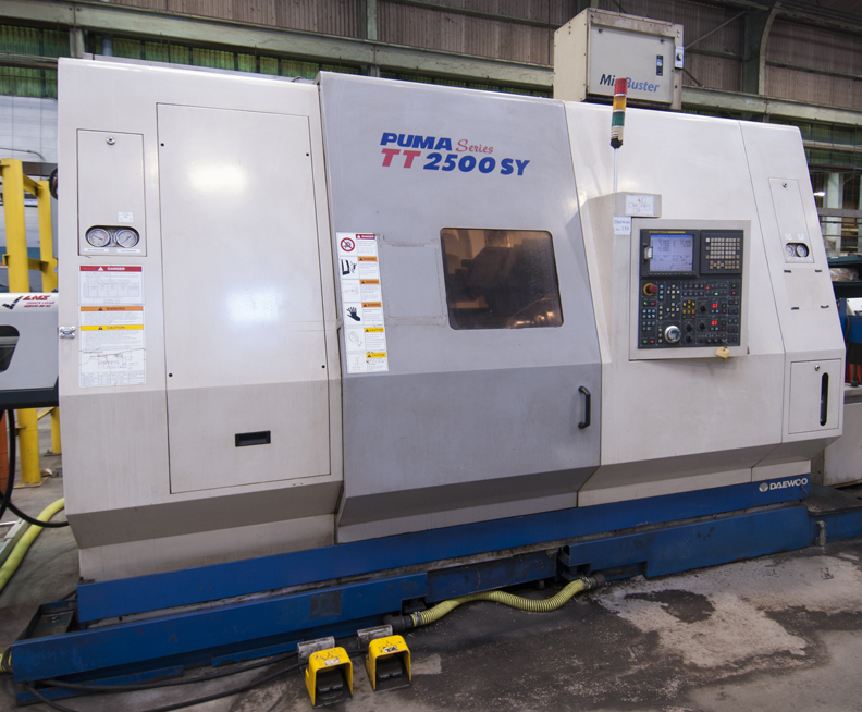 - DAEWOO (2008) PUMA TT2500SY CNC twin spindle turning and milling center, twin opposed spindles, twin opposed 12-station turrets, with FANUC series 18i-TB CNC control, c-axis, live milling, y-axis, 31.5” swing, 29.13” max turning length, travels X1 – 10.04”, X2 – 7.48”, Z1 – 31.5”, Z2 – 35.43”, Y – 4.72”, speeds to 3500 RPM, LNS SERVO8052 automatic bar feeder, LNS BLAZE AIR automatic un-loader, MASTER CONVEYORS chip conveyor, MCLEAN chiller, s/n: PT25SY0031