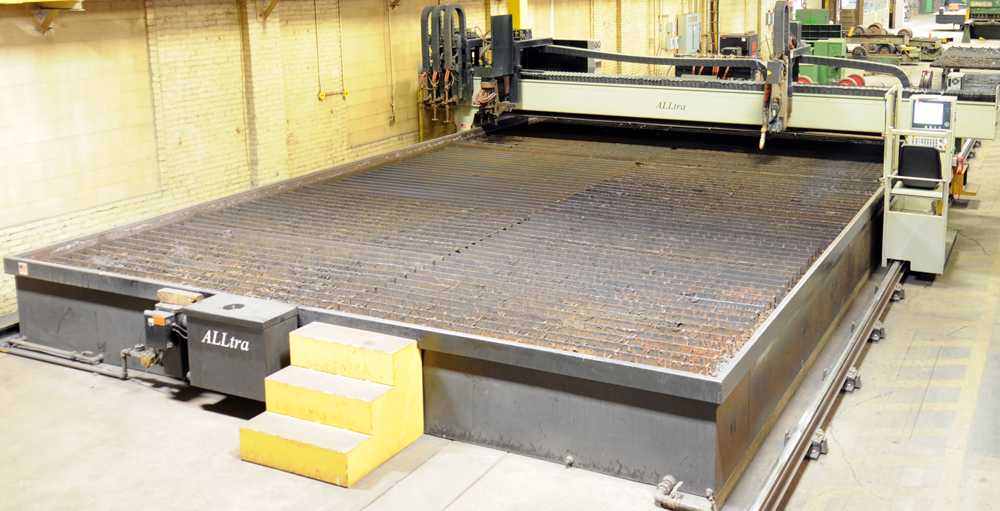 • ALLTRA (2011) PG30-20S gantry type CNC shape cutting machine, BURNY10 LCD PLUS CNC control, 20′ effective cutting width, 70′ overall rail length, HYPERTHERM HPR400XD HYPERFORMANCE plasma system with “Tru-Hole” Cutting Technology, (1) programmable plasma bevel station, (3) oxyfuel straight cutting heads, (4) head oxeyfuel torch bevel station, 44.5′ X 21.3′ water table, 12″ max plate thickness with oxyfuel, s/n 5974