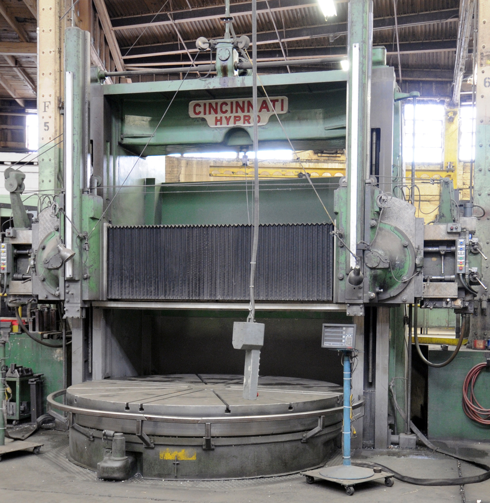 • CINCINNATI HYPRO 120″ vertical boring mill with 2-rams, 127″ max swing, 97″ max under tool holder, 102″ max distance under rail, 121″ table diameter, 77″ ram travel, ± 60º swivel of rams, rams, table speeds variable: 0 – 21 RPM, 40,000 lb. table load capacity, 50 HP table motor, 6-axis NEWALL DP1200 DRO s/n 6983