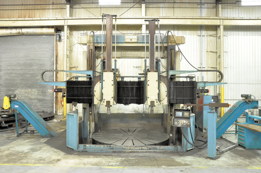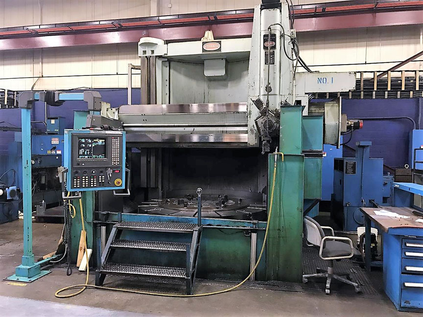 144″ Gray CNC Vertical Boring Mill, 144″ Table Dia., 152″ Max Swing, 120″ Max Height Under Rail, (2) Rams, Ram Swivel 45 Degrees, Table Speeds 0.6-54 RPM, Fanuc 0-T CNC Control, Retrofit 2002, 125 HP Table Motor, S/N 9510 VIEW VIDEO