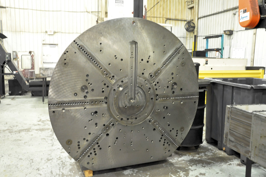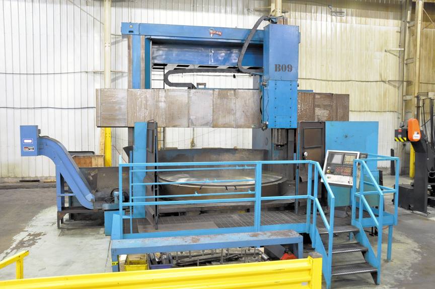 118″ Titan CNC Vertical Boring Mill, Model S298-8046, 118″ Table Dia., 137″ Max Swing, 78″ Max Height Under Rail (1) Ram, Retrofit with GE Fanuc 21i-T CNC Control, Fanuc Red Cap Motors, Flush Floor, Chip Conveyor, 73 HP Table Motor, S/N 356822
