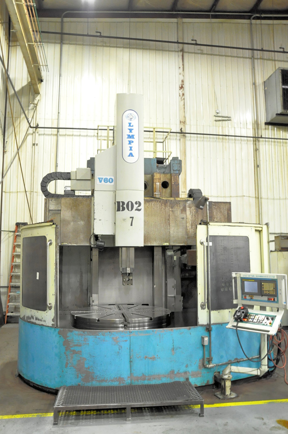 66″ Olympia V60 CNC Vertical Boring Mill, 66″ Table Dia., 70″ Max. Swing, 62″ Max Height Under Rail, 33,000 Lbs. Table Cap., 1-350 RPM, 12 ATC, Fanuc 21i-M CNC Control, 75 HP, 1999, S/N OE-99-329 VIEW VIDEO